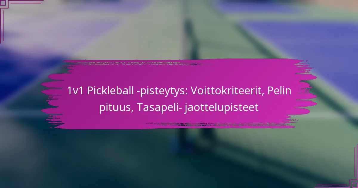 1v1 pickleballissa voittamisen ehdot keskittyvät pääasiassa pisteiden saamiseen ennalta määrättyyn kokonaispisteeseen, tyypillisesti 11 tai 15, samalla varmistaen vähintään kahden pisteen etumatka. Pelaajat voivat voittaa joko perinteisellä pisteytyksellä tai rallipisteytyksellä, joista kummatkin vaikuttavat pelin dynamiikkaan ja strategioihin.